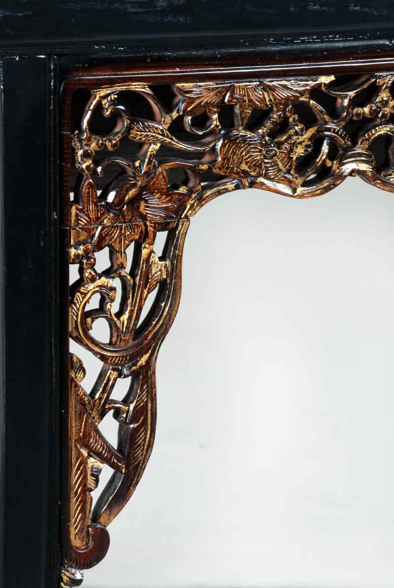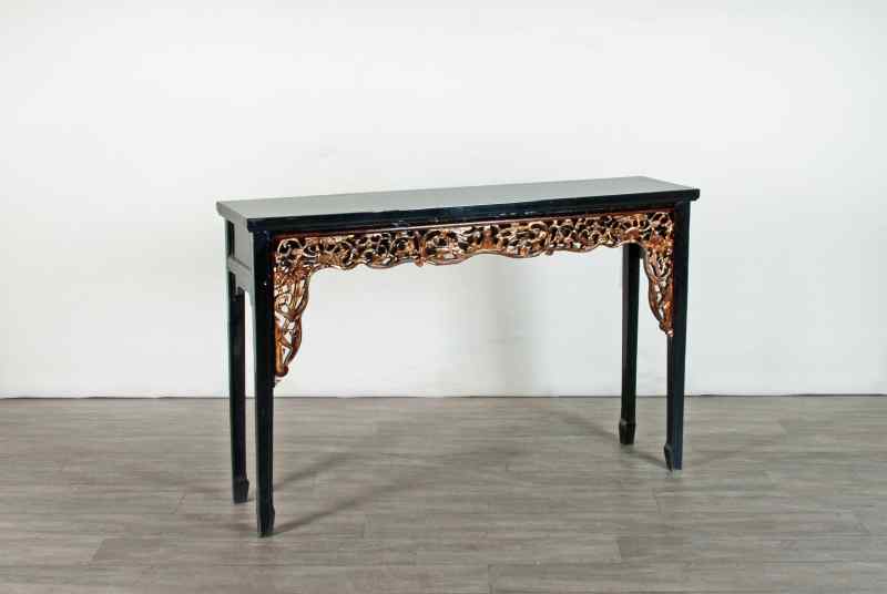 Der Altartisch wurde in der Zeit um 1900 in der Provinz Fujian in China gefertigt. Er ist schwarz lackiert und mit landestypischen Schnitzereien verziert.