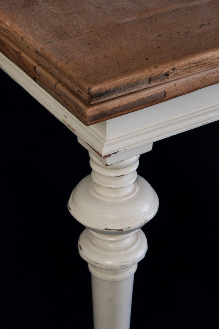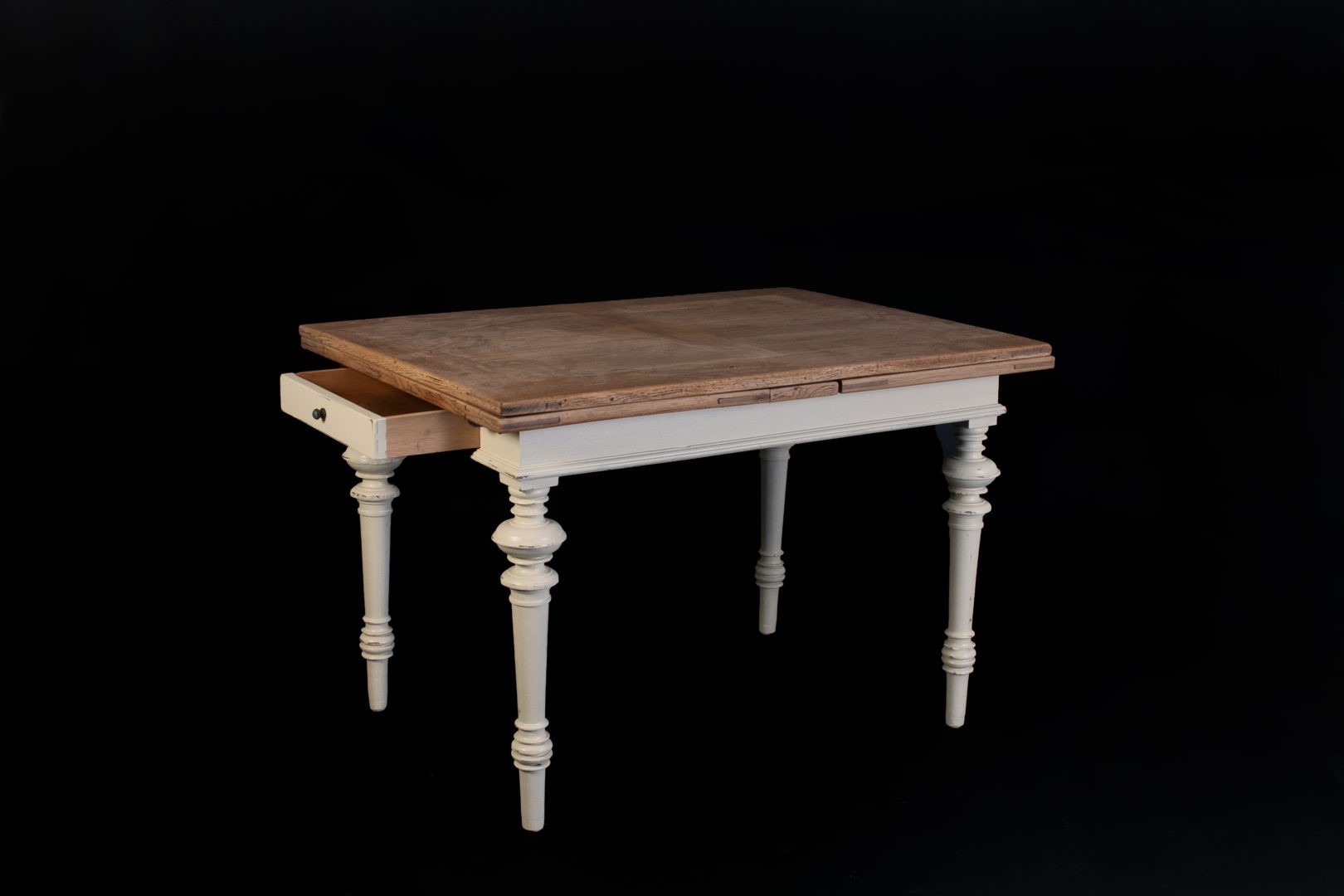 Der Tisch wurde um 1880 in Süddeutschland gefertigt. Die Tischplatte wurde aus Eichenholz gefertigt und das Gestell im Shabby-Chic-Stil lackiert. Er wird der Gründrzeit zugerechnet. Der Auziehtisch hat an der Stirnseite eine Schublade.