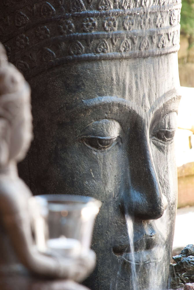 Dieser außergewöhnliche Brunnen ist aus Steinguss, handveredelt und coloriert. Die Vorlagen zu dem Khmerkopf kommen aus der kambodschanischen Tempelanlage Ankor Wat.