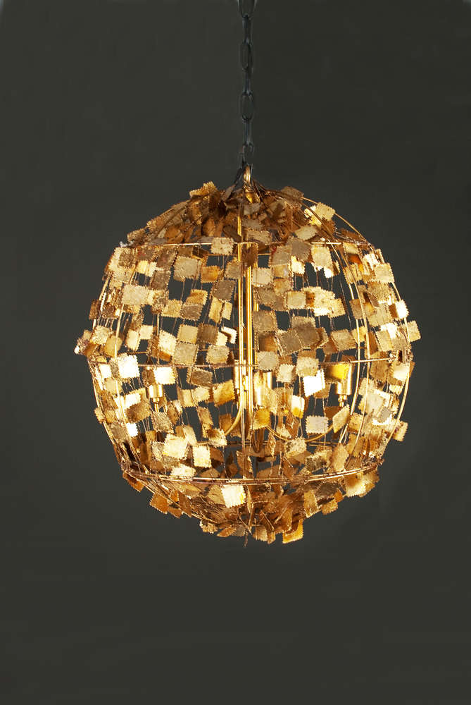 Die Lampe ist kugelförmig und mit Goldflittern besetzt.