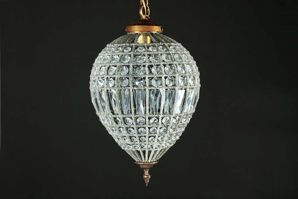 Der Lüster ist tropfenförmig gefertigt und die einzelnen Stäbe sind mit Perlenketten besetzt. In den Zwischenräumen befinden sich Glaskristalle. Oben und unten sind die Enden aus Messing. Auch in einer weiteren Größe erhältlich.