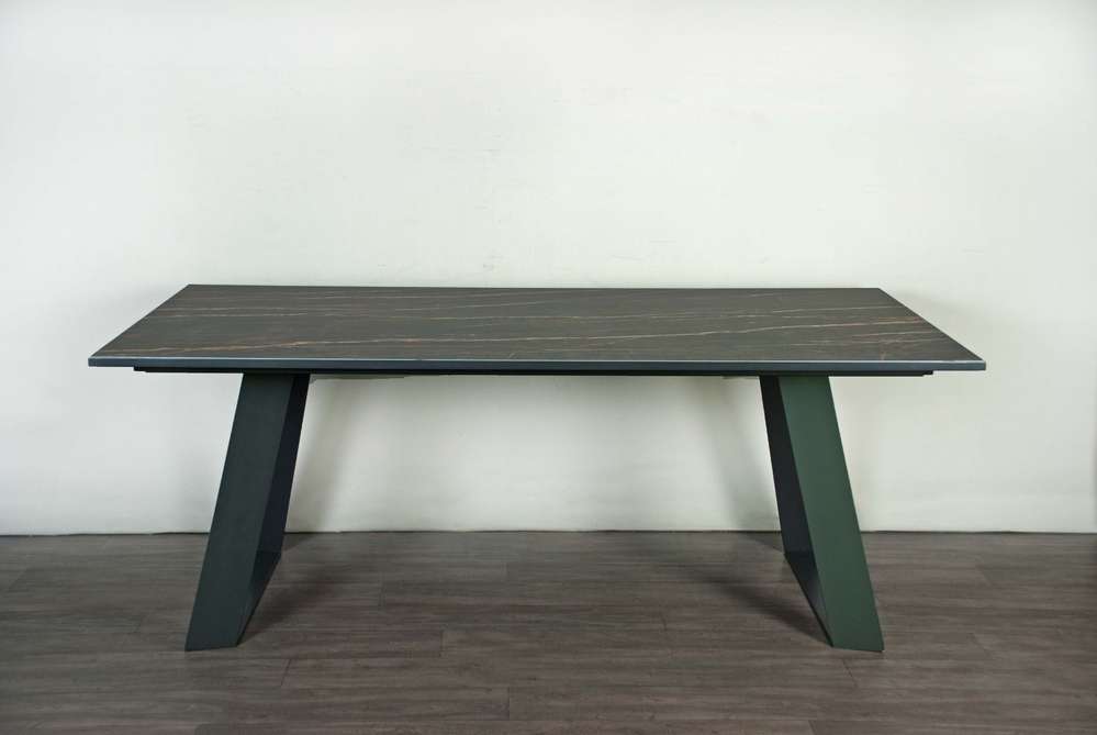 Der Tisch hat eine Keramikplatte im Marmorlook und ein Eisengestell.