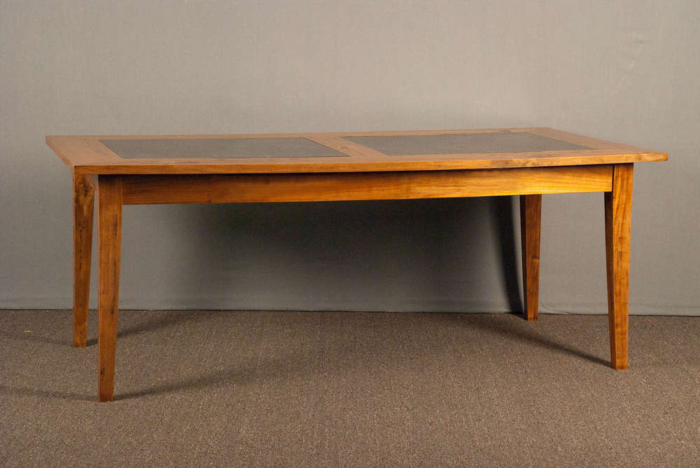 Der Landhaustisch wurde in Frankreich aus Teakholz gefertigt. In der Tischplatte sind zwei Steinplatten eingearbeitet. Diese haben leichte Kratzer. Zusätzlich gibt es noch zwei Ansteckplatten aus Holz.